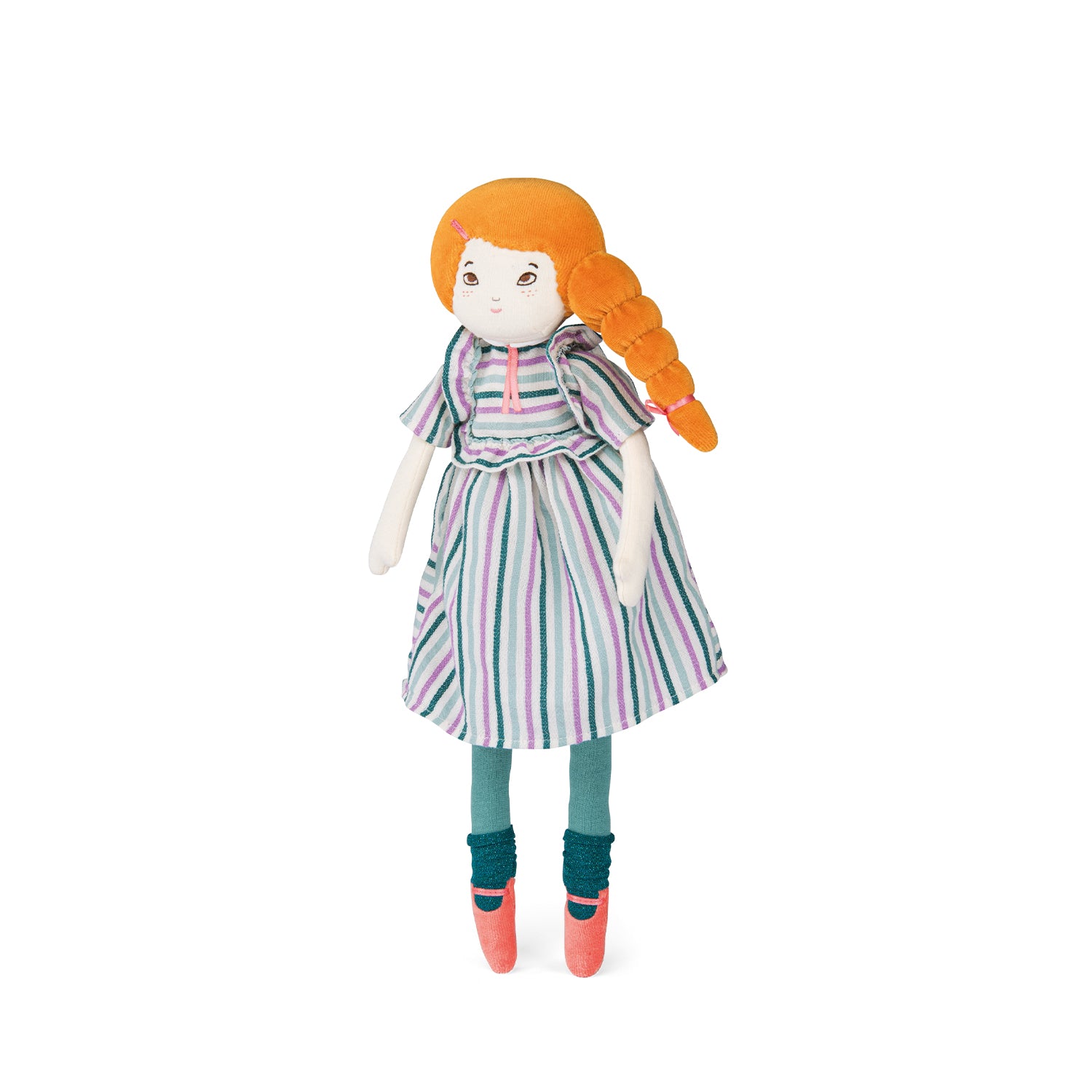 Mademoiselle Colette es una muñeca de trapo clásica pero con un twist moderno, su ropa en colores empolvados, mandilón y vestido, la trenza lateral, las bailarinas a juego... tiene un punto romántico-chic que la hace irresistible.